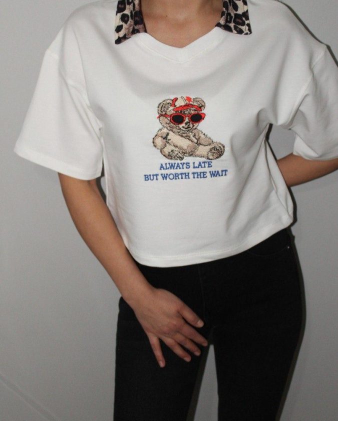 Leopar Desenli Polo Yaka nakış detaylı Crop Tshrt